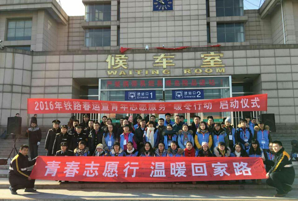 1月24日,2016年铁路春运暨青年志愿服务“暖冬行动”启动仪式在泰山火车站举行。济南铁路局济南车务段、泰山站、泰安团市委和我校团委相关负责人出席活动。