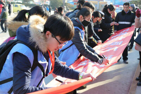 由我校青年志愿者和部分泰山站铁路职工组建的志愿服务队共同宣誓志愿服务精神,一起在印有服务承诺的条幅上郑重签下名字。仪式结束后,志愿者们随即以饱满的热情奔赴志愿服务岗位,与铁路职工一起奋战在运送旅客最前线,这也标志着2016年泰山火车站春运正式拉开帷幕。