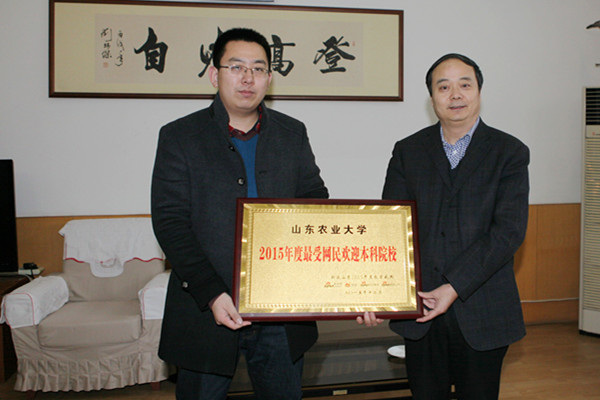 日前,“新浪山东2015年教育盛典”评选结果揭晓,我校与山东大学、中国海洋大学、中国石油大学(华东)等10所高校,获评2015年度山东最受网民欢迎的本科院校。1月7日,新浪山东教育频道主编白卫一行来校颁发奖牌,党委书记徐剑波会见客人,向新浪山东表示诚挚谢意,希望新浪山东在今后工作中一如既往关心支持山东农大,为学校营造更加良好的社会舆论环境。党委副书记车先礼代表学校接受奖牌。