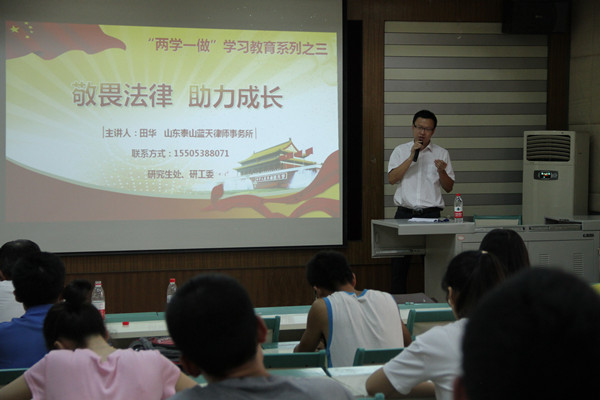 为扎实推进 “两学一做”学习教育,研究生处、研工委特别邀请了山东泰山蓝天律师事务所的田华律师为研究生上“讲规矩有纪律”专题党课。