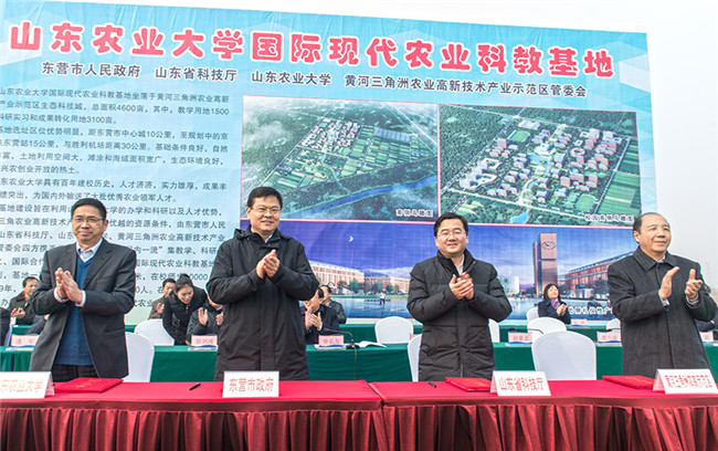 徐剑波在讲话中指出,与黄三角农高区、东营市、山东省科技厅合作共建国际现代农业科教基地,是山东农大服务国家重大战略、拓展办学空间、履行责任使命的重大机遇,更是创新发展理念、集聚科教优势、推动山东现代农业高质量发展的重要举措。学校将对标国际先进、国内一流,主动协同打造科学研究、人才培养、创新创业、成果转化、社会服务、国际合作、文化传承为一体的创新型科教基地。一是拓展学科领域,打造农科专门人才培育基地。结合区域需求,建设海洋与水产、草业与生态、现代农业等学科群。积极发展研究生教育和继续教育,培养实践和创新创业过硬的新农科优秀人才。二是集聚优势力量,打造现代农业科技成果研发、转化和示范区。围绕盐碱地利用与改良、海洋资源利用、生态建设等领域,引进和培养高层次人才,组建高水平协同创新团队,力争产出一批突破性原创成果。围绕国际现代农业产业链,重点面向一二三产业融合发展打造科技创新平台及成果转化基地,充分发挥示范带动作用。三是加强国际合作,打造具有国际影响力的科教平台。对接国际一流大学,合办高水平办学项目,打造具有全球影响力的国际协同创新和交流平台。借助“一带一路”农林科技教育合作联盟,推进沿线国家国际人才培养、农技人员培训、合作研发中心建设等实质性合作,提升服务国家战略和国际化水平。我们相信,在省科技厅、东营市委市政府的大力支持和黄三角农高区管委会的积极努力下,科教基地一定能成为国际先进、国内一流的农业“硅谷”,一定能成为国内外杰出农业科技人才的“集聚地”,为我国乃至世界农业的可持续发展道路提供理论创新与实践借鉴。