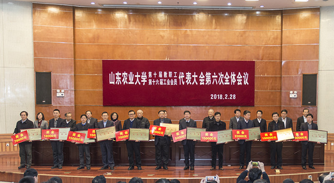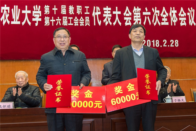会议表彰了获得学校2017年度重大贡献奖的集体和个人。党委副书记朱莉宣读表彰决定,农学院、党委宣传部、发展规划处等11个单位获集体“重大贡献奖”,其中一等奖3项、二等奖8项;田纪春、张民获个人“重大贡献奖”,其中一等奖1人、二等奖1人。