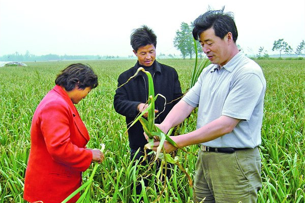 图为刘世琦教授(右一)在田间指导蒜农生产