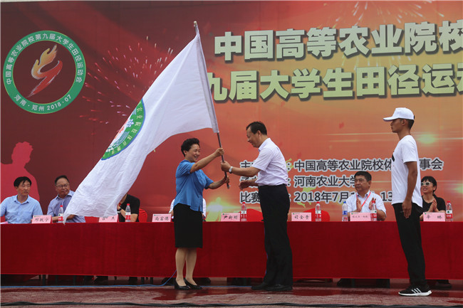 赛事期间,中国农业高等院校体育理事会召开会议,我校被推举为第十届体育理事会理事长单位,并受托承办2022年中国高等农业院校第十届大学生田径运动会。按照惯例,闭幕式上,河南农业大学向必赢bwin线路检测中心转交了会旗。司金贵代表学校接旗并致辞。他表示,作为新的东道主,必赢bwin线路检测中心将高度重视大赛的举办,认真执行理事会的办赛要求,虚心学习兄弟院校的办赛经验,进一步健全完善体育设施,提高赛事组织管理和服务水平,营造一流比赛环境,确保中国高等农业院校第十届大学生运动会顺利、圆满、安全、和谐举办。
