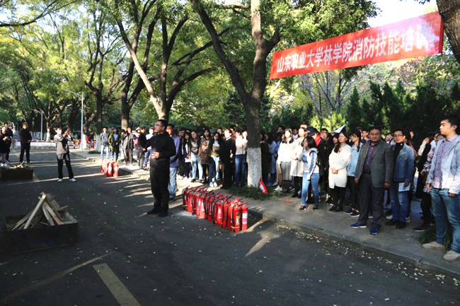 讲座结束后,学院组织师生在望岳路南头进行了灭火演练,演习教官用“提、拔、握、压”四个字生动形象地讲解了灭火器的使用方法及操作中的注意事项。师生踊跃参与,纷纷体验灭火器的使用方法。