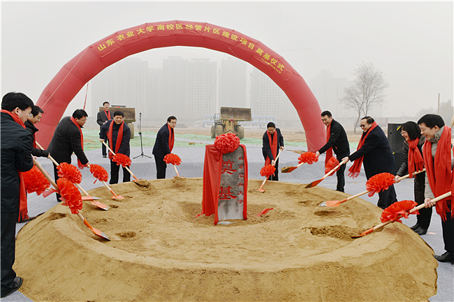 冬日的上午寒风阵阵,南校区经管片区建设项目现场却热火朝天。学校领导徐剑波、张宪省、杨天梅、嵇景涛、张明志、张然,北京城建亚泰建设集团董事长曹国章、常务副总经理张金峰、总经理助理吴怀刚,泰安长峰建设工程项目管理有限公司总经理张春锋等嘉宾都来到了仪式现场,为项目奠基培土。