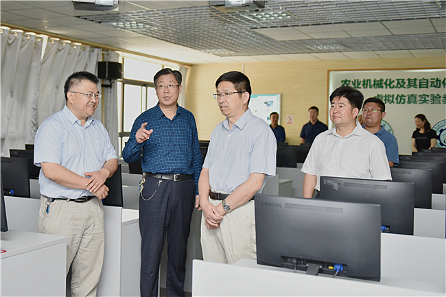 5月23日,校长张宪省到农业机械化及其自动化国家级虚拟仿真实验教学中心开展调研,听取机电学院专题汇报,查看中心教学设施,观看教师教学演示,与学院班子和专业教师深入交流,充分肯定中心取得成绩,同时对用好虚拟仿真教学手段,全面提高实验教学水平提出具体要求。