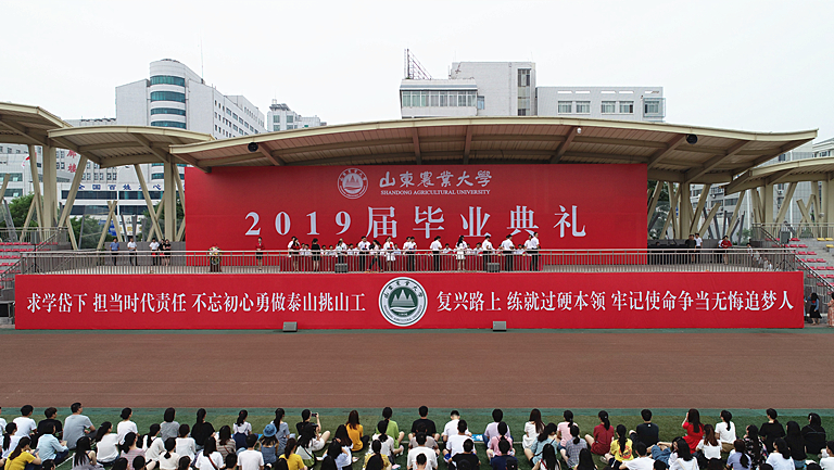 一条40米长的巨型横幅装点在北校区的体育场上,2019届毕业典礼的现场气势恢宏、庄严隆重,古色古香的毕业誓词、唯一编号的纪念徽章、学弟学妹的深情祝福、师长们的殷殷希望……母校送出的毕业礼物“独具匠心,情真意切,终生难忘”。6月20日,全体毕业生坚定地举起右拳,向着巍峨的泰山发出了出征的誓言,“为实现中国梦而不懈奋斗,在新时代的新征程中绽放青春光芒!”嘹亮的声音响彻整个山农校园,余音未落,毕业生们已背起行囊,奔向祖国的四面八方,奔赴干事创业的战场。