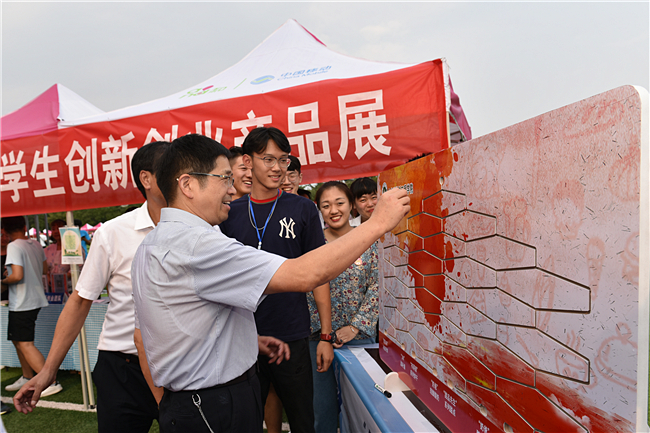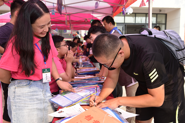 南北校区的迎新现场热闹非凡,欢迎新同学的气球条幅、红色拱门为新生营造到校如到家的温馨氛围,随处可见的志愿者有条不紊地做好服务引导工作,班主任、专家教授耐心地和新生及家长交流学科发展前景等,一下拉近了和新生的距离。各学院还分别设置了“筑梦农大”签名、泰山学者与学术大牛卡通形象展、时光信箱等别出心裁的环节,也把茶艺、食品、花卉、手工制作等方面的创业产品在迎新现场展示出来,让新生和家长现场感受学校创新创业教育的浓厚氛围。