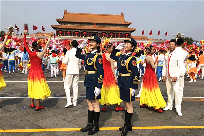 艺术学院2019届毕业生路新颖(上图前排左一)参军入伍,作为解放军联合军乐团的一名成员参加了今年的国庆阅兵式。谈起在现场的感受,仍然可以感受到她内心的无比激动。她说,能够光荣接受习近平主席的检阅、亲身经历如此气势磅礴的阅兵式是自己一生的荣耀。看着战友们从长安街的东头走到西头,脑海中浮现的是革命先辈从八一南昌起义开始,一路披荆斩棘走到今天。一代人有一代人的使命,一代人有一代人的担当,我们也有属于自己的战场。听党指挥、能打胜仗、作风优良是我们矢志不渝的使命追求,我们要为实现中华民族伟大复兴中国梦保驾护航!