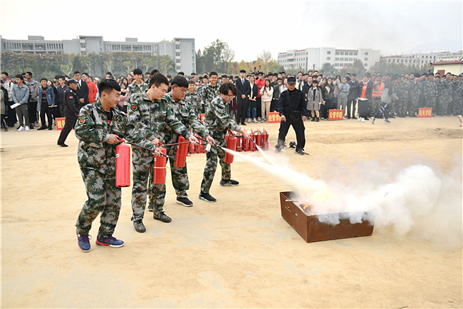 第二部分,公安处消防科科长周广全介绍了消防安全自救的基本常识,现场演示了灭火器、消防栓等消防器材的使用,并组织学生进行了灭火演练。同学们踊跃参加,亲身体验了灭火过程,掌握了灭火器的使用方法,增强了消防安全意识,提高了逃生自救能力。