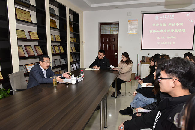 12月17日,党委书记徐剑波来到他担任班主任的经管学院(商学院)2018级金融1班,以“坚定自信、学好本领,在奋斗中成就青春梦想”为题,为班里32名青年学生讲授思政课。