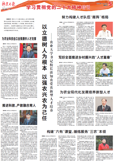 11月10日,《科技日报》学习贯彻党的二十大精神特刊围绕知农爱农新型人才培养和中国特色、世界一流大学建设,邀请农业大学书记校长撰文畅谈学习体会。党委副书记、校长冷畅俭以《努力构建人才队伍“雁阵”格局》为题撰写署名文章,围绕学习贯彻党的二十大精神,介绍学校知农爱农新型人才培养情况和今后工作举措。全文如下: