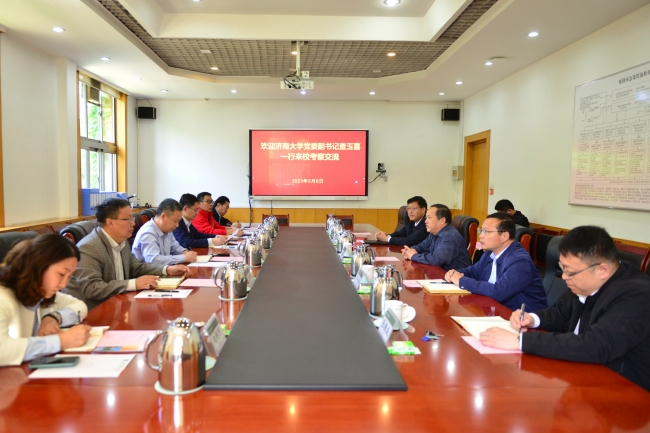 5月8日,济南大学党委副书记查玉喜等一行来访,围绕干部选任与考核、宣传思想、统战及巡察工作等进行考察交流。学校党委副书记嵇景涛会见客人并座谈。