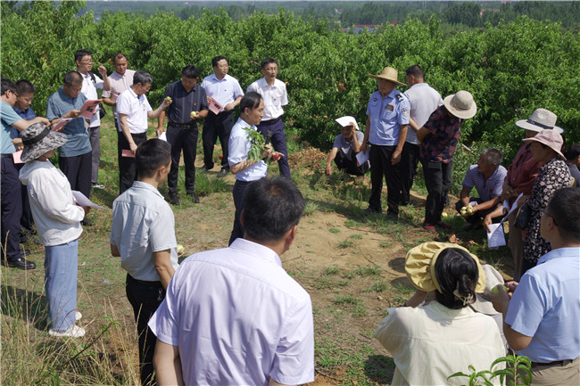 得知此事后,参与的植保专家越来越多。21日,植保学院党委书记安宁、院长原雪峰带队,再次赴垛庄果园镇现场调研。随行的专家,有擅长桃穿孔病防治的刘振宇教授、有提出桃园全程(不套袋)植保技术方案的薛超彬教授、有拿出用药防治害虫方案的刘永杰教授,还有专注林果病虫害防控的昆虫学系党支部书记闫毅副教授,陈珍珍、于成明、田叶韩等几位青年教师也加入了科技支农队伍。