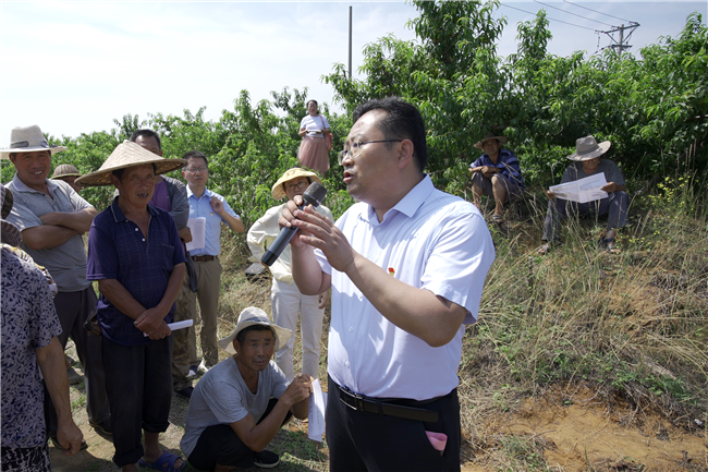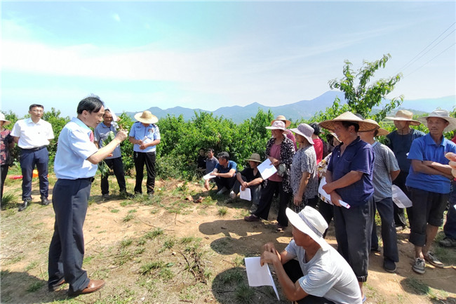 在桃园现场,刘振宇教授就桃穿孔病问题跟果农们沟通发病原因,介绍 “一清园、二套袋、三喷药、四壮树”的防治方案;原雪峰教授介绍主要病害的防治要点和后期管理原则;薛超彬教授介绍桃园农药使用方案;参加活动的青年教师回答果农关于桃园害虫的管理技术问题。听说农大专家到田间地头作技术指导,果农纷至沓来越聚越多,现场记录、拍照、录像,拿着专家给的明白纸,像收到了灵丹妙药,笑得合不拢嘴。