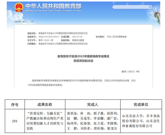 近日,教育部公布《关于批准2022年国家级教学成果奖获奖项目的决定》,我校姜世金教授主持的“‘供需反转、互融互促’产教融合培养动物生产类应用型创新人才的研究与实践”成果,荣获国家级教学成果奖二等奖。截至目前,我校共获得国家级教学成果奖9项,其中国家级教学成果特等奖1项、一等奖2项,二等奖4项,优秀奖2项,省级教学成果奖103项。